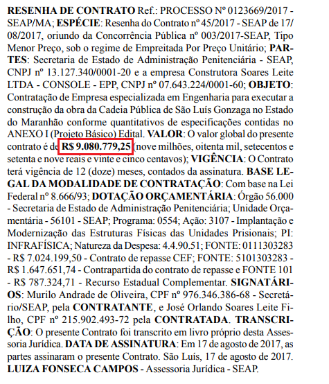 O contrato firmado entre a SEAP e a Soares Leite tem validade de 12 meses.