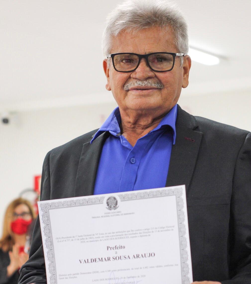 O Tribunal Regional Eleitoral do Maranhão (TRE-MA) entregou, pela terceira vez, o diploma de prefeito de Lago dos Rodrigues para Valdemar da Serraria (DEM). Nas últimas eleições Valdemar foi eleito com 4.349 votos, o equivalente a 67,09% dos votos.